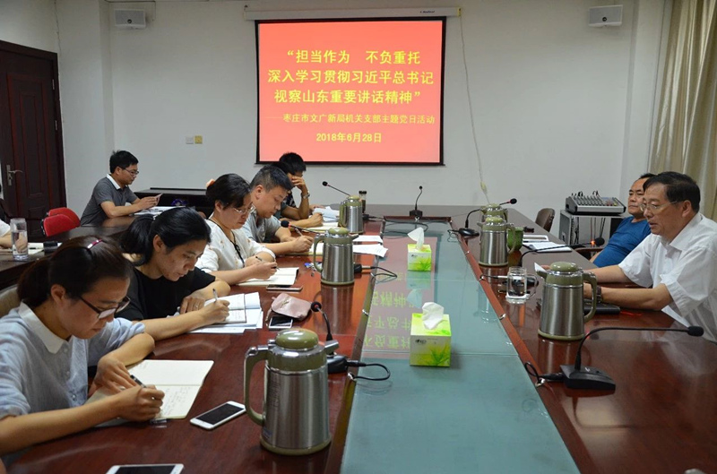 6月28日下午,市文广新局机关支部“担当作为、不负重托、深入学习贯彻习近平总书记视察山东重要讲话精神”主题党日活动在局会议室举办。