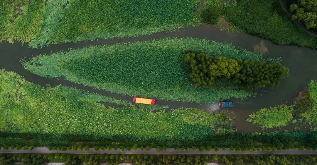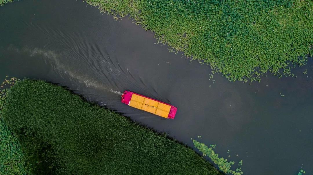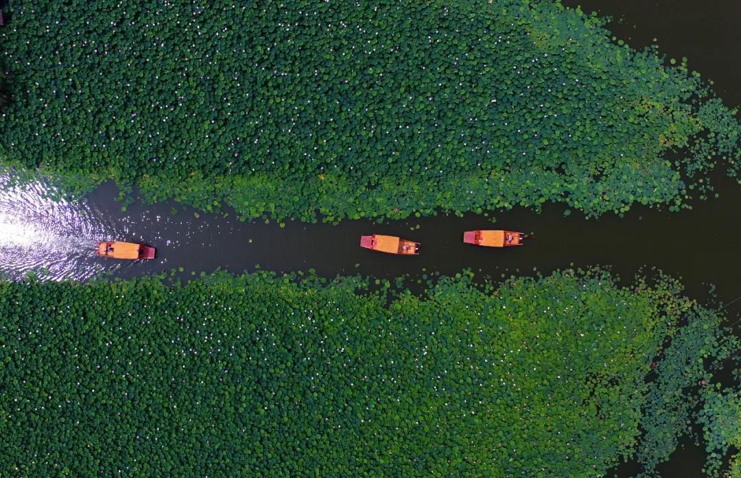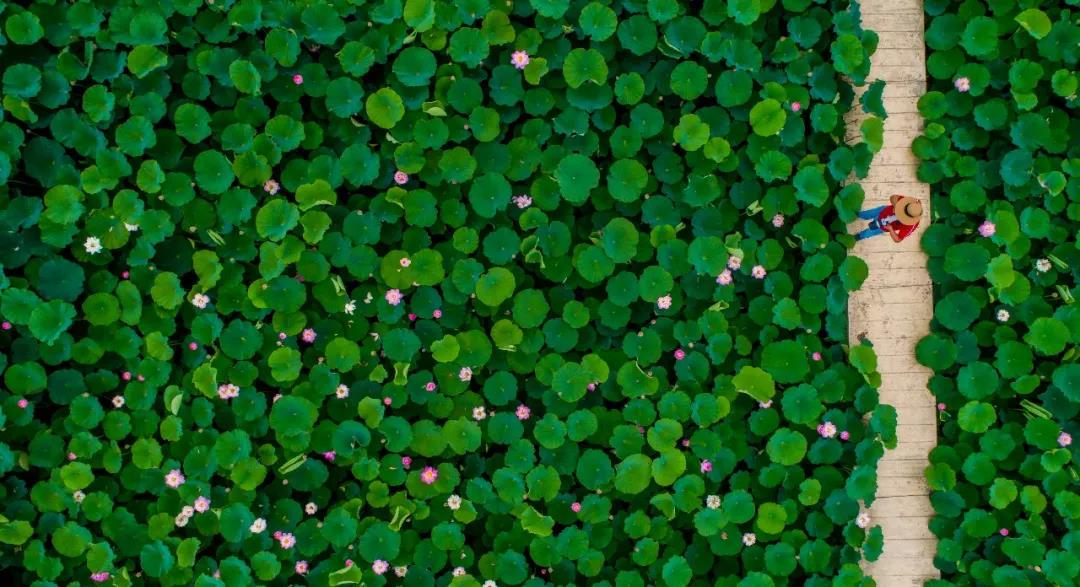 不知是谁,采用航拍的模式,把两艘画舫船定格在了荷香的韵味里。我定睛一看,水道犹如干净的玻璃栈道,荷塘俨然就是绿色的氧吧。那画舫船里的才子或佳人呢?想必不是热情的阳光,就是温柔的月色!