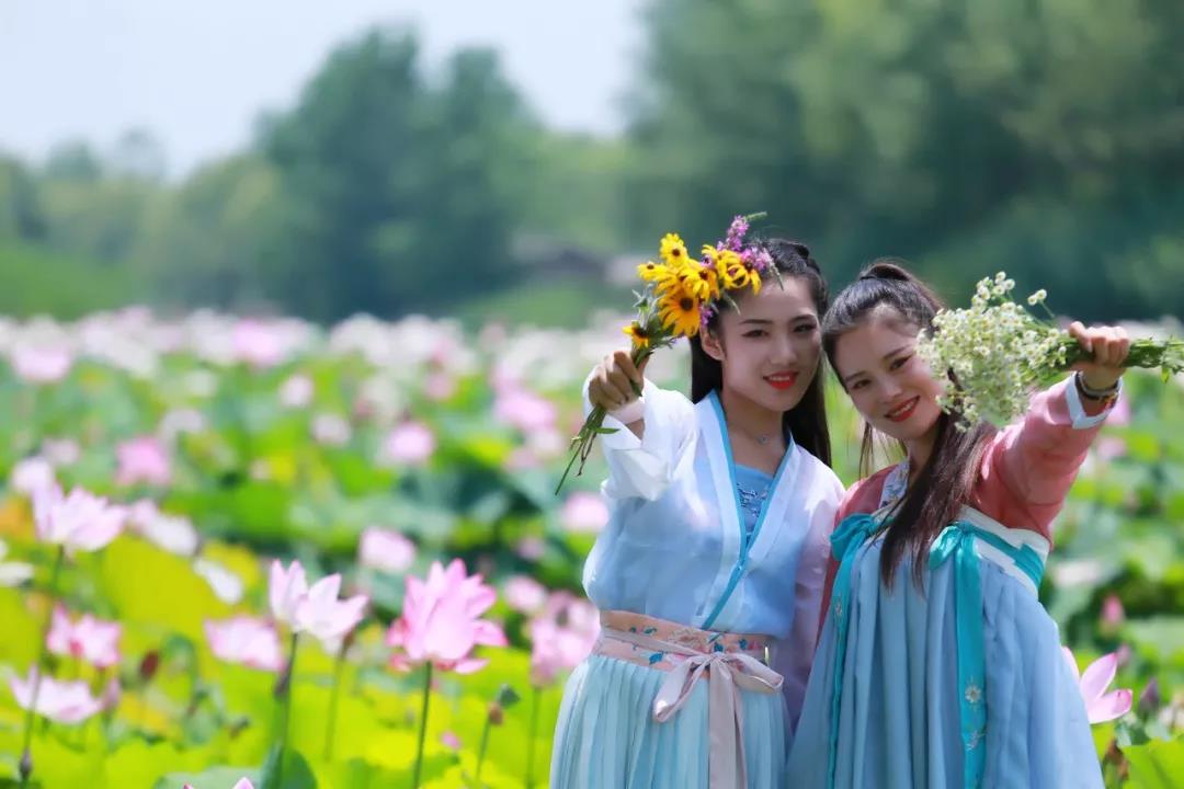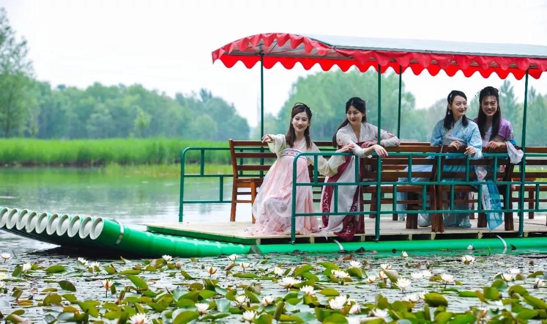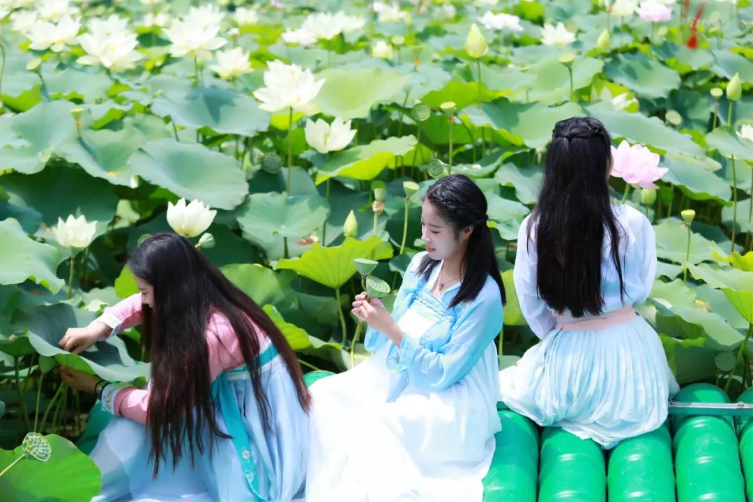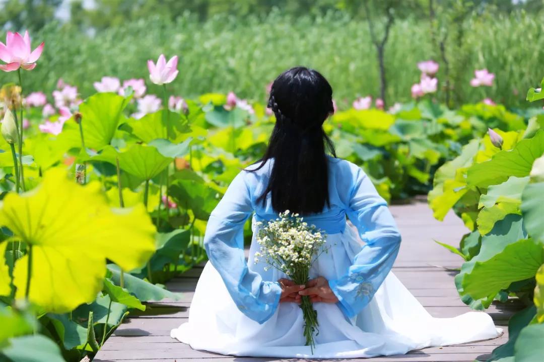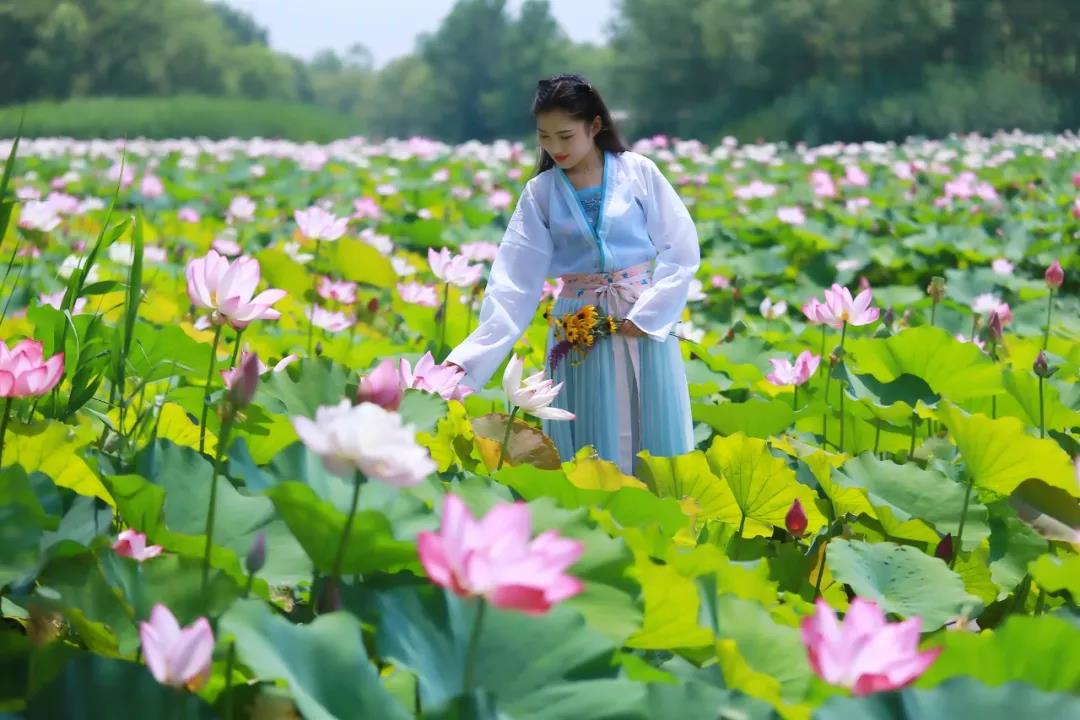花中不可能没有仙子,仙子不可能没有行船。这真是“舟行碧波上,人在画中游”呀!当然,行船是从行人开始的。徜徉在十里荷花廊,惬意的心,不由地举机相机,与天籁之姿合影留念。这,就是运河湿地的魅力。不经意间,唐代诗人王昌龄的《采莲曲》穿越到了我们的身边:“荷叶罗裙一色裁,芙蓉向脸两边开。乱入池中看不见,闻歌始觉有人来。”