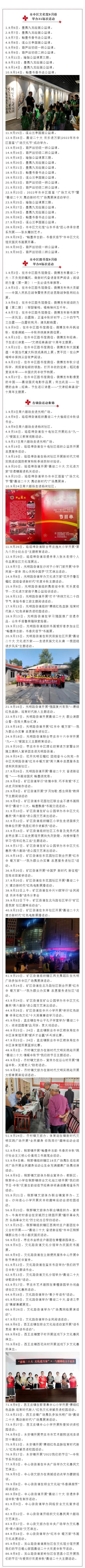 市中区文旅局充分发挥区图书馆、区文化馆、镇街文化站、文化驿站等文化阵地优势,常态化开展“周六剧场”文化惠民演出、“让文物走进你”文物六进、“非遗五进”“ 墨舞九龙”“ 溪山兰亭” 书画培训等公共文化品牌服务活动,让文化活动融入群众的日常生活。9月份市中区群众文化活动开展120余场次,重点活动如下: