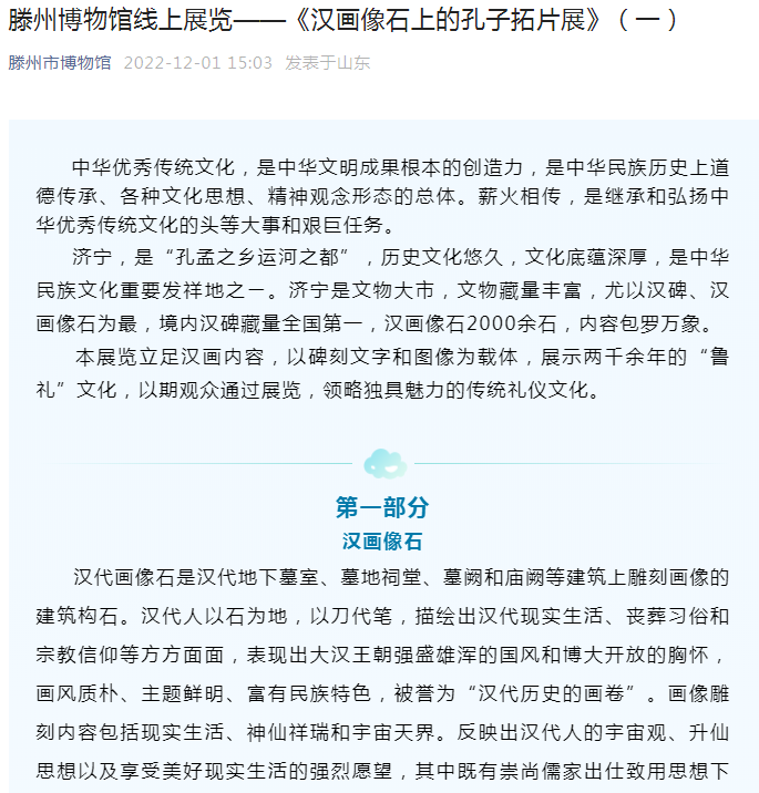 11、11月28日,滕州博物馆举办线上展览——《汉画像石上的孔子拓片展》(一)。