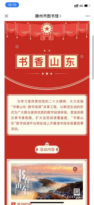 18、滕州市图书馆微信公众号“书香山东”数字阅读平台线上读书闯关答题竞赛活动开始啦!快来报名参加吧!