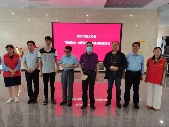 活动仪式上,齐靓、李英杰为中国盲文图书馆枣庄市图书馆支馆揭牌,枣庄市图书馆作为枣庄市残健融合文体服务示范中心被市残联、市文旅局授予牌匾。市图书馆介绍了无障碍阅读环境建设开展情况,为前来参加活动的视障人员赠送智能听书机,市图书馆志愿者帮助出席活动和视障者人员体验无障碍电影、助视器等视障阅读设备,“阅读”盲文书刊,助力视障者共享阅读之美。