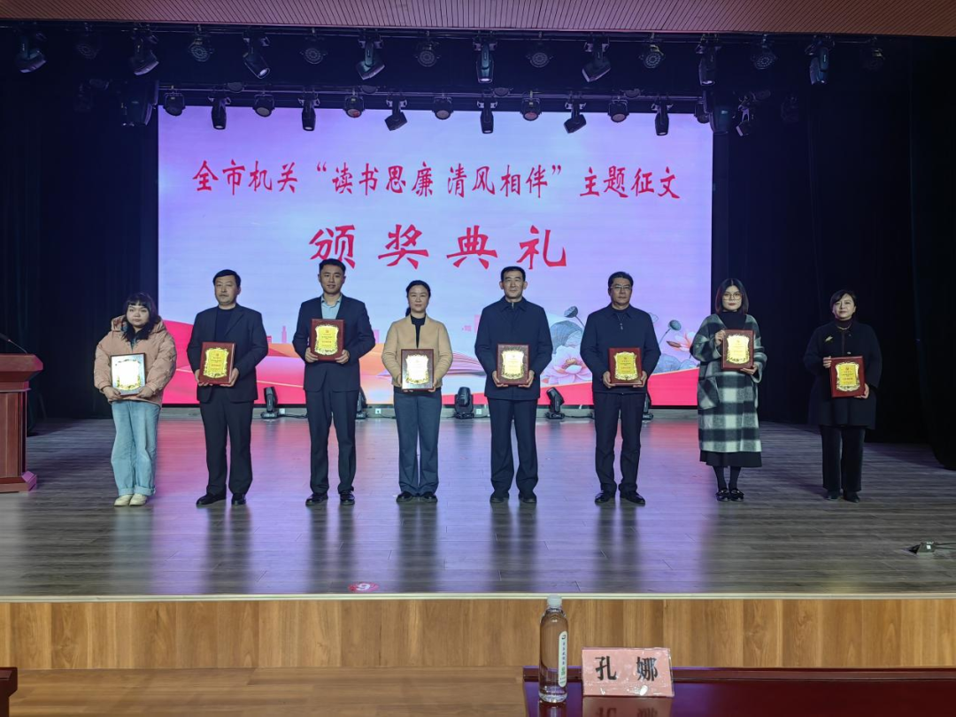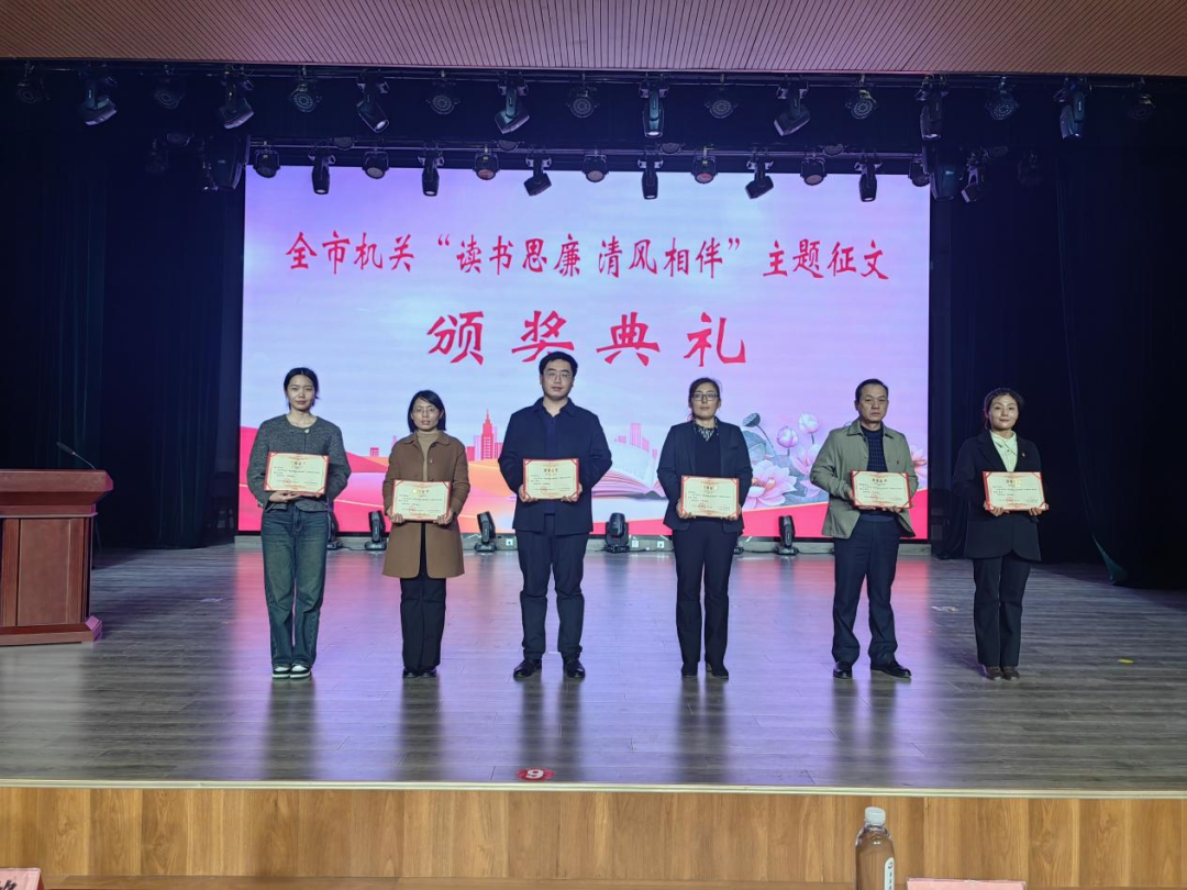 会上,传达学习了《第二届山东省全民阅读大会会议精神》,并为山东省第八届全民阅读先进典型代表、枣庄市机关“读书思廉 清风相伴”主题征文活动优秀个人和单位代表、枣庄市第四届最美书香家庭、家庭图书馆和最美家庭书房获奖者代表颁发证书和奖牌。