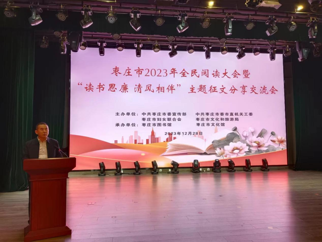 为深入贯彻第二届山东省全民阅读大会会议精神,2023年12月28日上午,由中共枣庄市委宣传部、中共枣庄市委市直机关工委、枣庄市妇女联合会、枣庄市文化和旅游局主办,枣庄市图书馆、枣庄市文化馆承办的枣庄市2023年全民阅读大会暨“读书思廉 清风相伴”主题征文分享交流会在枣庄市文化馆(新馆)4楼演艺厅召开。市纪委监委宣传部部长孙海峰,市直机关工委副书记、纪检监察工委书记王光忠,市妇联党组成员、副主席孔娜,市文旅局副局长张勇,市文旅中心副主任王炜燕等出席会议。