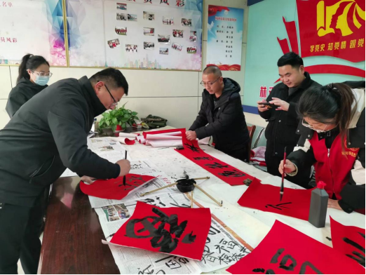 60.1月28日枣庄市运河支队红色书画院的书法绘画大师们来到丁庄村活动现场,将新春的美好祝福通过字画送福到百姓家门口。