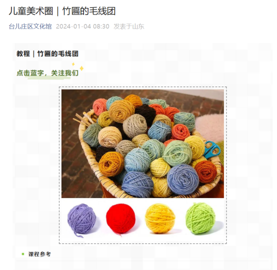 2.1月3日下午,区文化馆组织风雅颂艺术团成员们在文化馆三楼活动室开展花篮舞《南泥湾》培训活动。3.1月4日上午,台儿庄区文化馆在微信公众号发布“儿童美术圈|竹匾的毛线团”。4.1月5日上午,台儿庄区文化馆在微信公众号发布“诗歌鉴赏——孩子们的诗(1)”。5.1月8日上午,台儿庄区文化馆在微信公众号发布“三百书画作品展之百位将军书画展线上展(17)”。6.1月10日,在台儿庄区文化馆微信公众号发布“中国民艺馆|家伙什儿——木匠工具:刨”。7.1月10日下午,区文化馆在三楼活动室组织舞蹈爱好者们开展广场舞《欢聚一堂》表演培训活动。8.1月11日,台儿庄区文化馆在微信公众号发布“诗歌鉴赏——王昌卫《返回》”。9.1月12日,台儿庄区文化馆在微信公众号发布“美术鉴赏课|绘画史上最早理论专著(1):顾恺之《论画》”10.1月14日上午,台儿庄区文化馆在馆内书画室举办硬笔书法公益培训第一期。课上指导老师教授学生学习“竖撇”及例字“开、升、川”的写法并复习了“斜撇”及“在、左、 右”写法。11.1月15日下午,台儿庄区文化馆组织文化文艺志愿者在馆内三楼活动室开展新编《红娘》排练活动。12.1月16日,台儿庄区文化馆组织舞蹈爱好者们开展腰鼓舞表演培训活动。13.1月17日上午,台儿庄区文化馆在微信公众号发布“三百书画作品展之百位将军书画展线上展(18)”。14.1月18日上午,台儿庄区文化馆在二楼书画活动室举办“过腊八,剪窗花!”活动。15.1月18日下午,台儿庄区文化馆组织舞蹈爱好者们开展腰鼓舞表演培训活动。16.1月19日下午,台儿庄区文化馆组织民间游艺演出团队排练游艺展演活动。17.1月22日,台儿庄区文化馆在微信公众号发布“诗歌鉴赏——王昌卫《卖糖球的女人》”18.1月23日,台儿庄区文化馆在微信公众号发布“中国民间美术赏析||剪纸:女十忙”19.1月22日下午,台儿庄区文化馆组织文化文艺志愿者在华阳社区开展“强过复兴有我——台儿庄区‘唱支红歌给党听’文艺展演”活动。20.1月23日下午,台儿庄区文化馆组织文化文艺志愿者在华阳社区开展“礼赞新时代 艺起想未来”台儿庄区文化馆优秀文艺作品展演活动。21.1月24日上午,台儿庄区文化馆组织文化文艺志愿者在文化馆活动室开展太极扇《中国功夫》排练活动。22.1月25日上午,台儿庄区文化馆在微信公众号发布“中国民间美术赏析||剪纸:梁祝过河”23.1月27日上午,台儿庄区文化馆组织小朋友们在馆内书画室一起探索龙年创意涂鸦的奇妙世界。24.1月29日下午,台儿庄区文化馆组织群众在工人文化宫活动室开展歌咏比赛活动。25.1月30日下午,台儿庄区文化馆组织文化文艺志愿者在馆内三楼活动室开展柳琴戏《懒大嫂赶会》排练活动。26.1月31日上午,“龙跃齐鲁·乐享非遗”2024春节台儿庄区“非遗赶大集”活动在涧头集镇薛庄大集隆重举行。27.1月1日—1月31日,台儿庄区文旅局深入马兰屯镇、邳庄镇、涧头集镇、泥沟镇、张山子镇五个镇的个行政村,组织“台儿庄区2023年戏曲进乡村”活动。演员们为群众带来了戏曲、歌曲、舞蹈、快板等精彩节目。28.1月1日—1月31日,台儿庄区文化馆在山东公共文化云发布【我的资讯】,共17期。29.为进一步弘扬了优秀传统文化,推动全民阅读,更好满足人民精神文化需求,丰富广大读者的精神文化生活。1月台儿庄区图书馆通过微信公众号推送20篇,包含新书推荐及红色故事绘——每日荐读系列。小人书七天“悦”读——连环画阅读推荐,线上讲座,微信展文化惠民线上展、视频推读系列展”微信展。