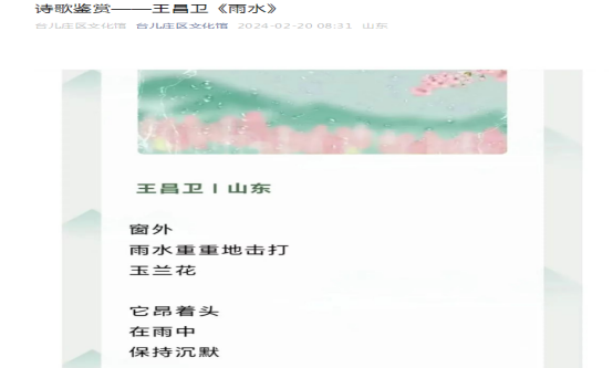 19.2月20日上午,台儿庄区文化馆在微信公众号发布“诗歌鉴赏—王昌卫《雨水》”。