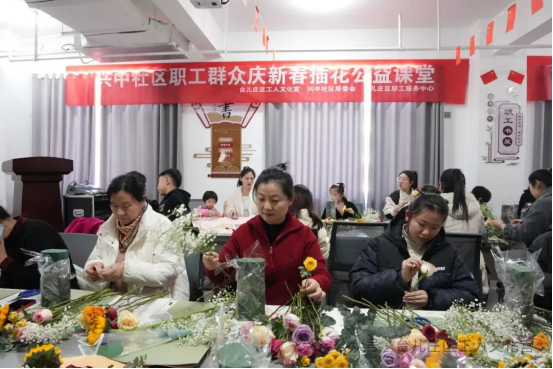 40. 2月13日,正月初四,台儿庄区工人文化宫联合运河街道兴中社区举办的“过年七天乐”庆新春插花公益课堂在职工书屋(城市书房)举行。