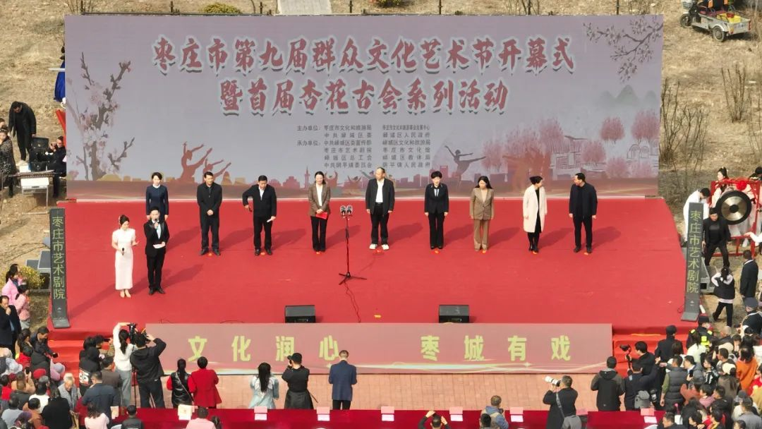 3月16日,枣庄市第九届群众文化艺术节开幕式暨首届杏花古会在峄城区阴平镇举行。仪式上,与会领导敲锣启动了枣庄市第九届群众文化艺术节开幕暨首届杏花古会活动,共同观看了文艺表演,并参观了古会现场。