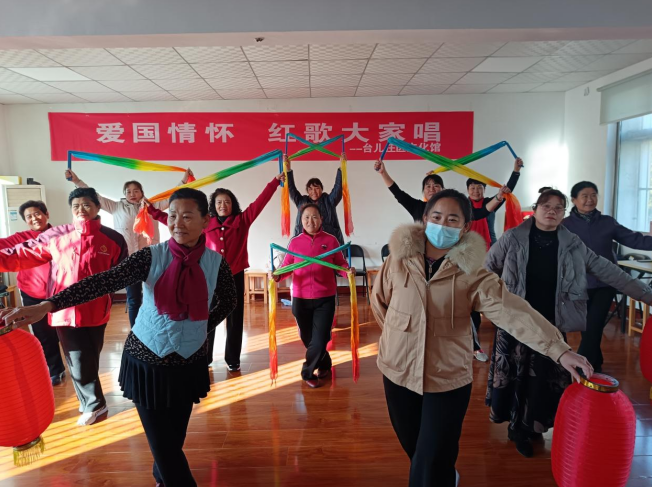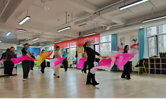 25.11月26日,在区文化馆三楼活动室文艺爱好者们进行彩带灯笼广场舞培训活动。