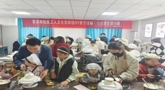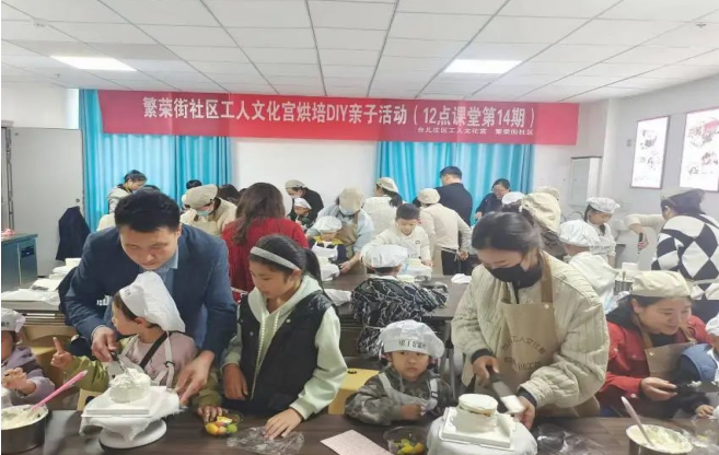 31.11月2日中午,台儿庄区工人文化宫联合繁荣街社区在烘焙实训工坊开展“亲子浓情 烘焙时光”主题蛋糕DIY制作活动。