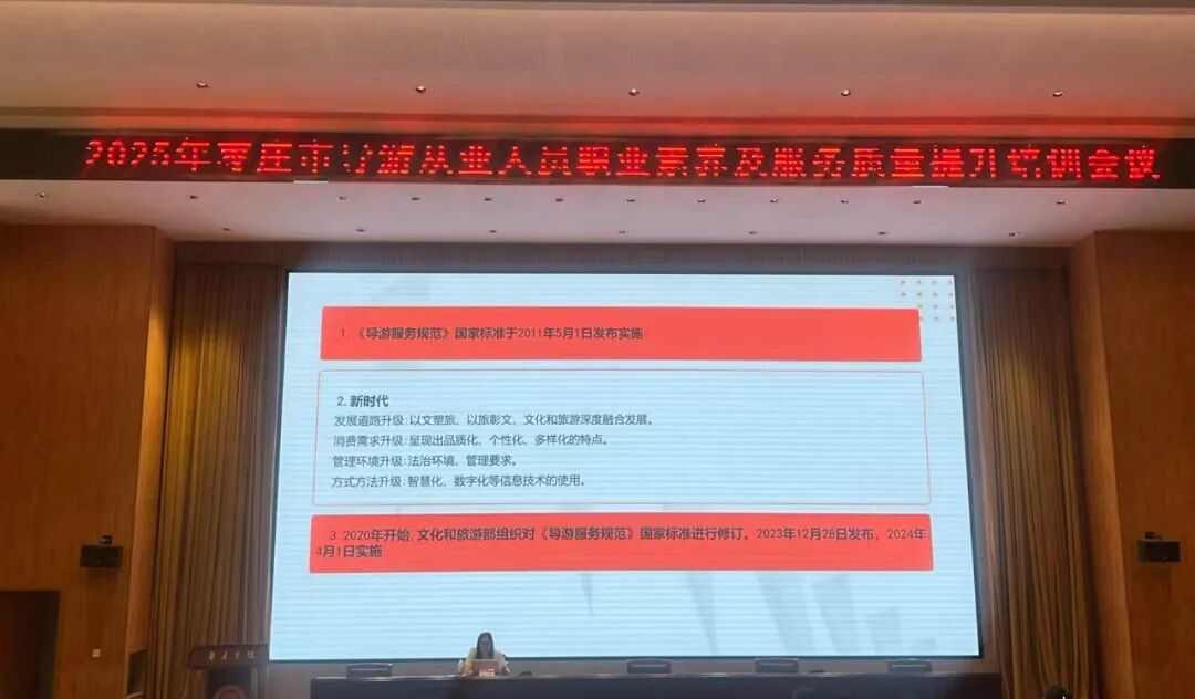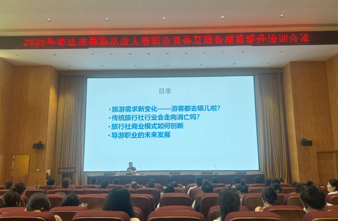 为高效推进我市旅游服务质量提升,规范促提全市导游从业人员综合素质和服务水平,8月29日,2025年枣庄市导游从业人员职业素养及服务质量提升培训会议在枣庄学院顺利举办。全市持证专兼职导游员,A级旅游景区、文博场馆讲解员等70余人参加培训。