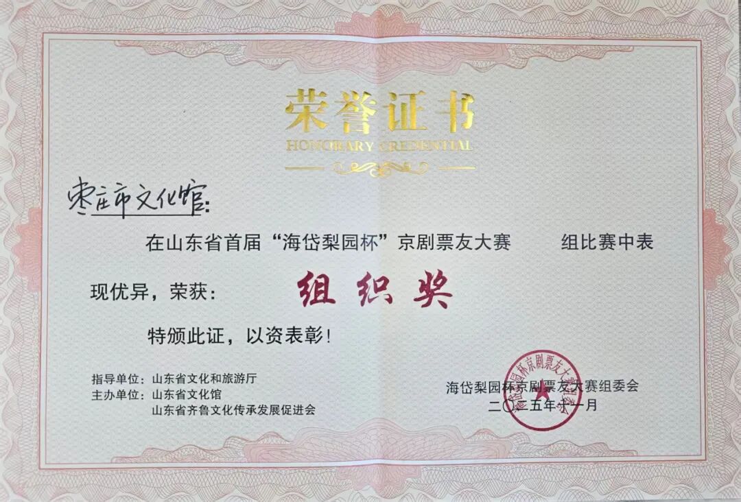 经过激烈角逐,枣庄市1名选手凭借炉火纯青的表演技艺,从众多参赛者中脱颖而出,荣获“十佳票友”称号;另有3名选手以扎实的功底与鲜明的个人风格,斩获大赛优秀奖。此外,枣庄市文化馆因在赛事组织、选手选拔、后勤保障等方面表现突出,被授予“优秀组织奖”,多项荣誉的背后,是枣庄市对京剧文化传承的重视与深耕。