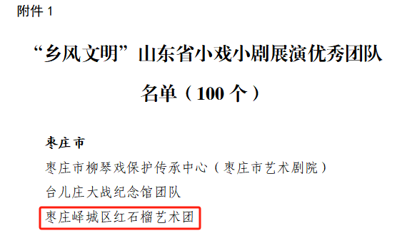 近日,山东省委宣传部组织“乡风文明”山东省小戏小剧展演优秀团队评选。全省评选优秀团队100个,枣庄峄城区红石榴艺术团成功入选。