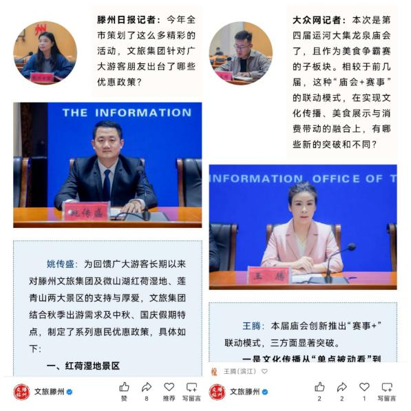 滕州市围绕县域旅游高质量发展需求,以官方解读、宣传矩阵、惠民活动为抓手,实现政策解读渠道从单一发布会向全媒体矩阵延伸,宣传覆盖面从传统媒体向新媒体平台拓展,政务服务从被动响应向主动赋能转型,探索建立了文旅领域政务公开特色宣传推广新模式。