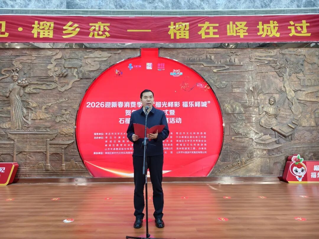 宋俊峰在致辞中指出,近年来,峄城区深入贯彻习近平总书记关于文旅工作的重要论述和视察枣庄重要指示精神,积极落实中央及省、市委部署,文旅事业成效显著。区图书馆、文化馆新馆相继建成开放,先后获评国家一级馆。村(社区)综合性文化服务中心实现全覆盖,每年举办“戏曲(电影)进乡村”等文化惠民活动4000余场、服务群众20万余人(次),“峄城欢乐汇”省级群众文化活动品牌持续擦亮。深耕文旅康养产业,先后获评全国休闲度假旅游名区等荣誉称号。去年以来,“榴光峄彩·福乐满园”等系列活动成功举办,既弘扬了传统文化、丰富了群众生活,也为全区经济社会高质量发展贡献了文旅力量。本次贺年会将紧扣群众文化需求和消费升级趋势,推出一系列文旅特色活动,引导景区、酒店推出优惠套餐,让利于民、让惠于民,全方位展现峄城石榴的自然之美、文化之韵与产业之兴,以艺术赋能文旅,为经济社会发展注入新动能。