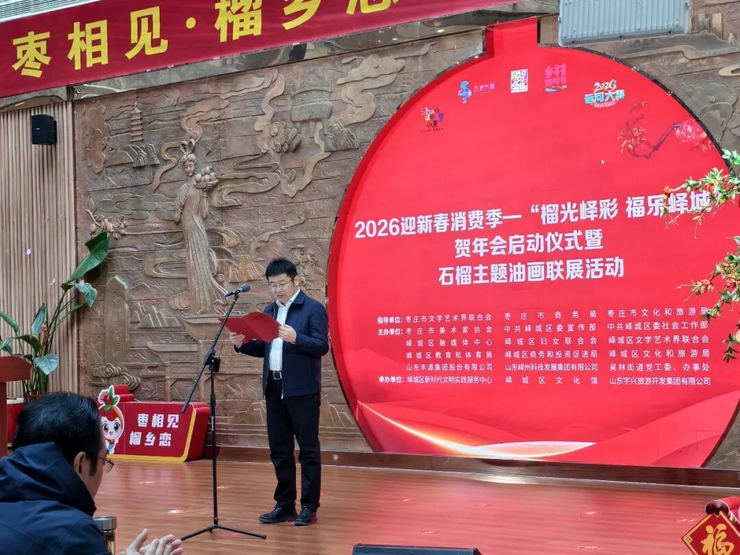 马年踏春来,榴乡启新章。1月28日,2026迎新春消费季——“榴光峄彩 福乐峄城” 贺年会启动仪式暨“马迎新春・榴画贺岁—具象・意象石榴主题油画联展”在峄城区文化馆隆重举行。市文联党组副书记、副主席、二级调研员李从望,市商务局党组成员、市商务发展促进中心主任王立波,枣庄学院美术与艺术设计学院副院长、教授邢军,市美术家协会副主席、台儿庄区委宣传部四级调研员李楠,峄城区副区长张志祥出席活动;市文旅局党组成员、市文化市场综合执法支队支队长孙业武出席活动并讲话,峄城区委副书记、政法委书记宋俊峰出席活动并致辞,区委常委、宣传部部长陈倩主持活动;区直有关部门主要负责同志、分管负责同志,各镇(街道)分管负责同志和具体负责人,相关文旅企业、商超、酒店、景区负责人、新闻媒体记者,以及吴林街道驻地群众代表等参加活动。