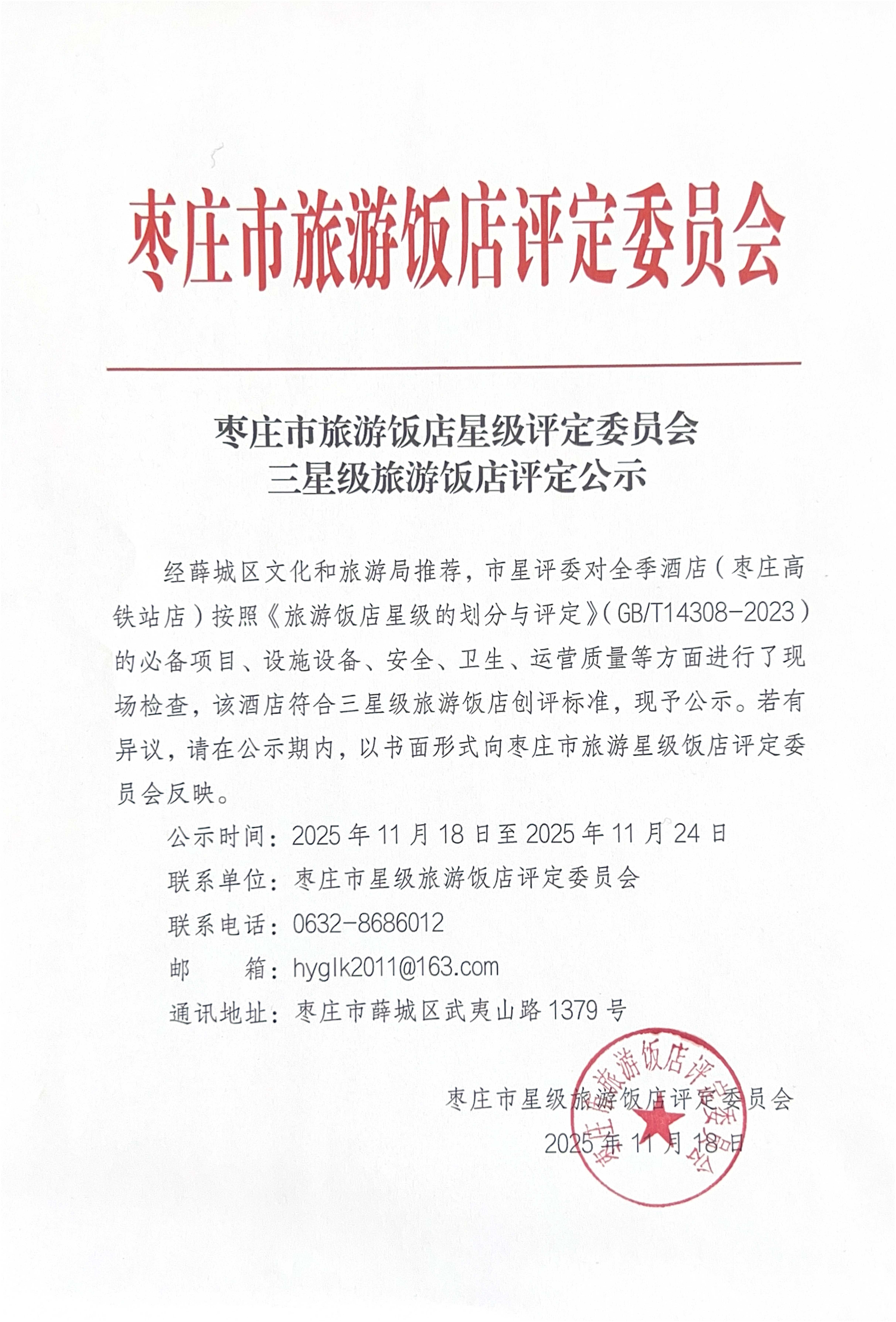 枣庄市旅游饭店评定委员会三星级旅游饭店评定公示
