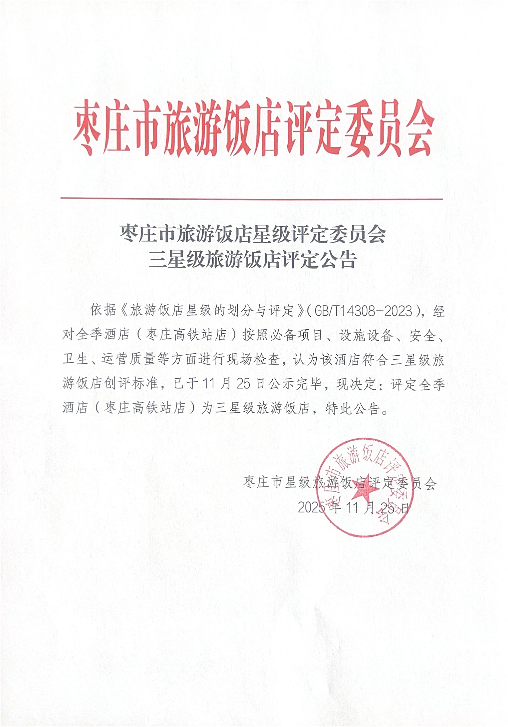 枣庄市旅游饭店评定委员会三星级旅游饭店评定公告