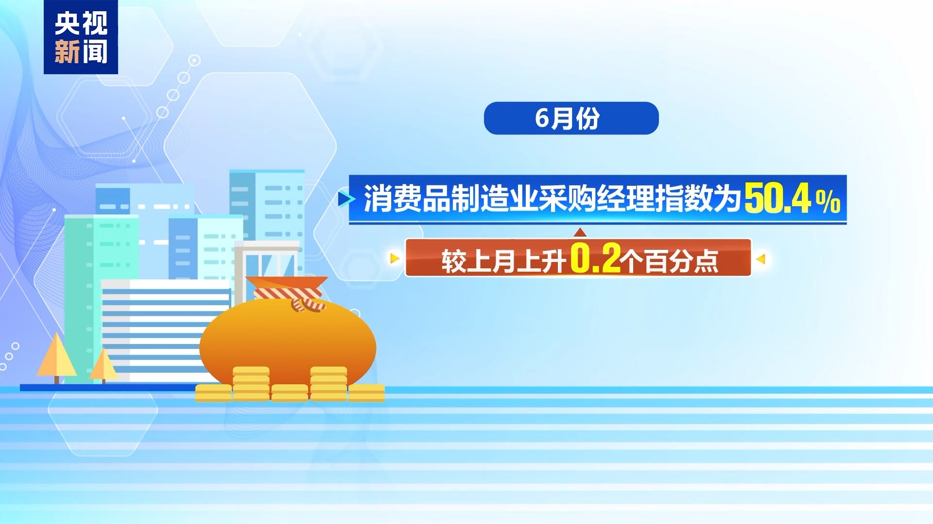 在一系列促消费政策的落实显效下,消费品制造业也实现稳中有增。6月份消费品制造业采购经理指数为50.4%,较上月上升0.2个百分点。基础原材料行业运行也有所回稳,基础原材料行业采购经理指数较上月上升0.8个百分点,结束了连续3个月下行态势。